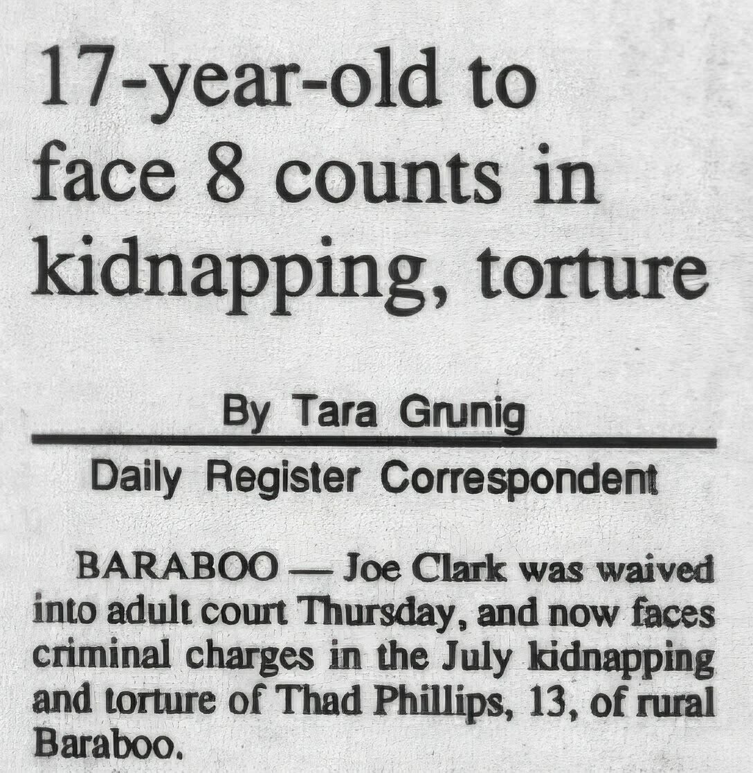 Thad Phillips (1995) A year later, in July 1995, 12‑year‑old Thad Phillips was abducted from his home in the middle of the night. Clark took him to his house, where he held him captive for roughly 40 hours. During that time, Clark intentionally broke Thad’s bones—legs, ankles, feet—while keeping him alive and conscious. Thad later said Clark talked about previous victims and described the injuries almost clinically. Thad managed to escape by crawling up a staircase while Clark slept, finding a phone, and calling for help. His survival cracked the case open. Aftermath Thad’s testimony led investigators back to Chris Steiner’s death. Evidence from Clark’s home, along with forensic re‑evaluation, tied him to both boys. Clark was arrested in 1995 and ultimately sentenced to life in prison. Today, the case is remembered not just for its brutality, but for the resilience of a child who survived long enough to expose a predator hiding in plain sight.